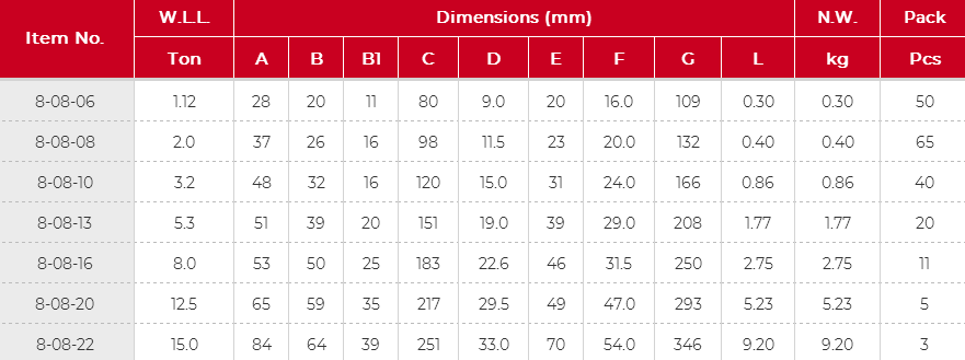鉤子是設計用于與80級合金鋼鏈條、鋼絲繩。 將能力、PASAK和壓印在產品上。 材料:高強度合金鋼鍛造 建設:熱處理、高溫治療(調質) 安全系數:4:1臺灣帕薩克PASAK環眼吊鉤
