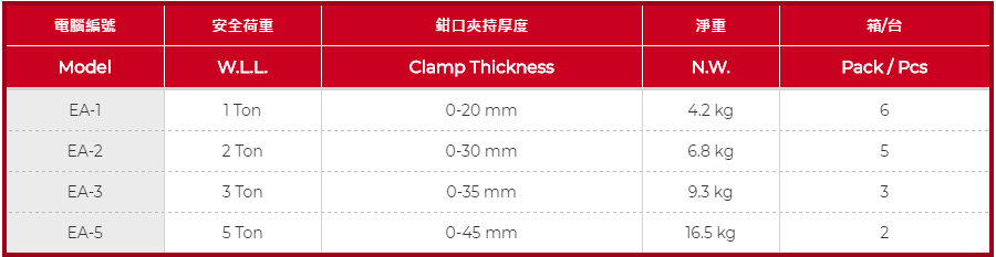 產品特性:材質:合金鋼鍛造結構:熱處理高溫處理安全鎖機制產品上面印製吊裝載荷量,P.S.K和WLL的浮雕標誌安全係數:3:1使用用途:E型立吊專為鋼板的升降起吊而設計的,以一只試驗為額定載荷,吊裝作業中單只或兩只配套使用,立吊擁有安全鎖裝置,起吊時必須將拉環手柄向上以使彈簧拉緊,卸荷